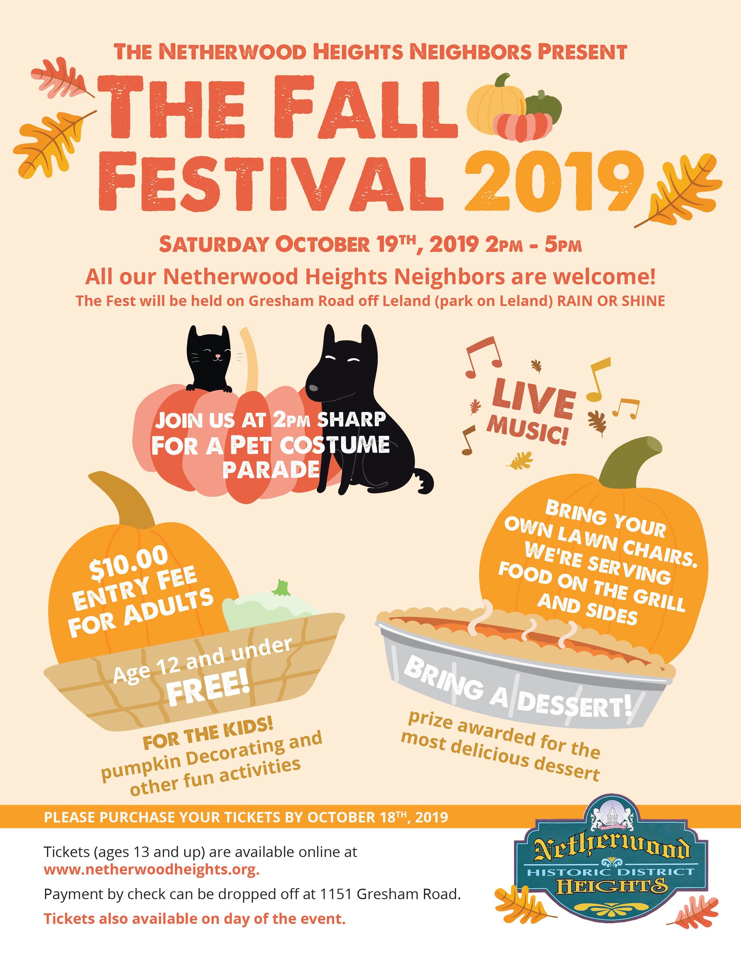 Saturday, October 19, 2019 from 2 PM to 5 PM on Gresham Road (park on Leland). Join your neighbors for fun, food, live music and pet costume parade. Tickets $10 (13 and over). Children 12 and under are free.